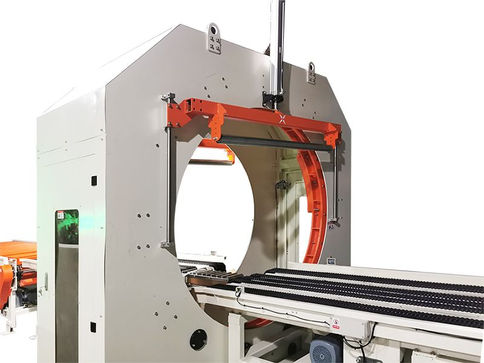 1. Die horizontale vollautomatische Verpackungsmaschine verwendet LLDPE-Stretchfolie, um palettierte Güter zu sichern.
